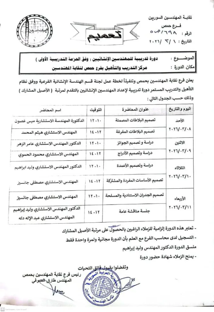 تعلن نقابة المهندسين السوريين – فرع حمص عن إقامة دورة تدريبية للمهندسين الإنشائيين (وفق الحزمة التدريبية الأولى)، وذلك في مركز التدريب والتأهيل التابع لفرع النقابة.