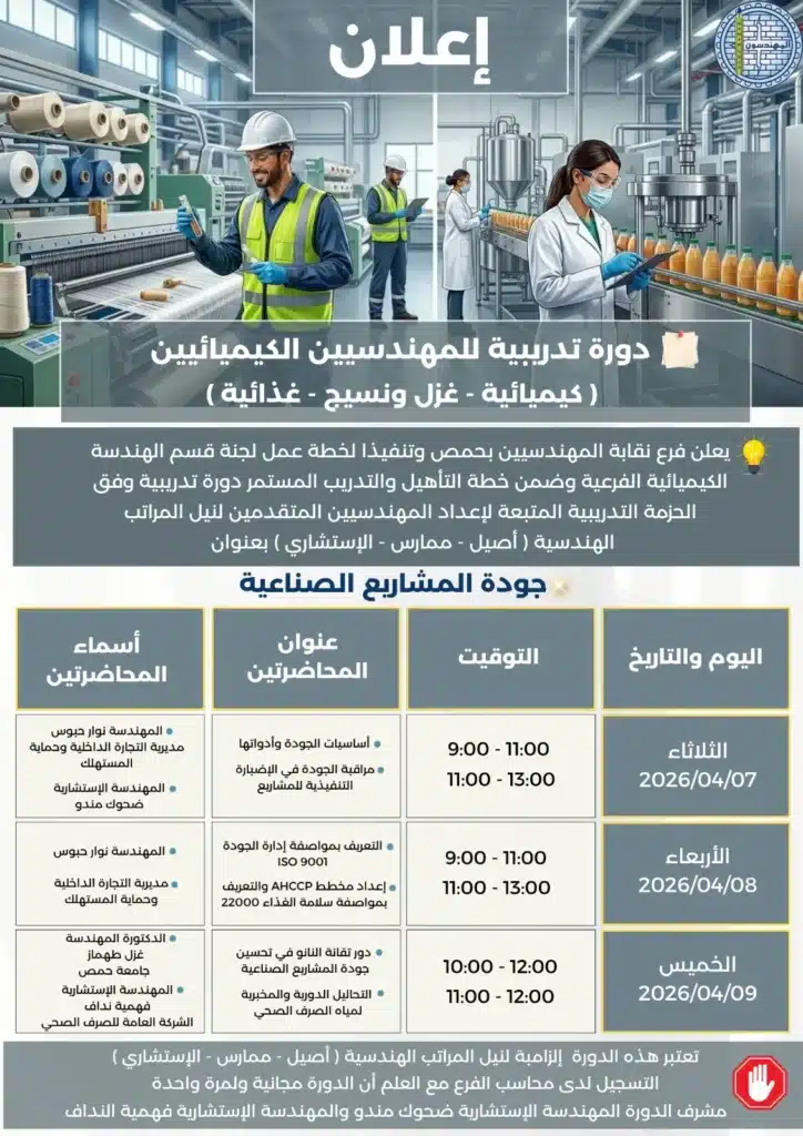 دورة تدريبية للمهندسين الإنشائيين (وفق الحزمة التدريبية الأولى ) يعلن فرع نقابة المهندسين بحمص عن إقامة دورة تدريبية تخصصية (الحزمة […]