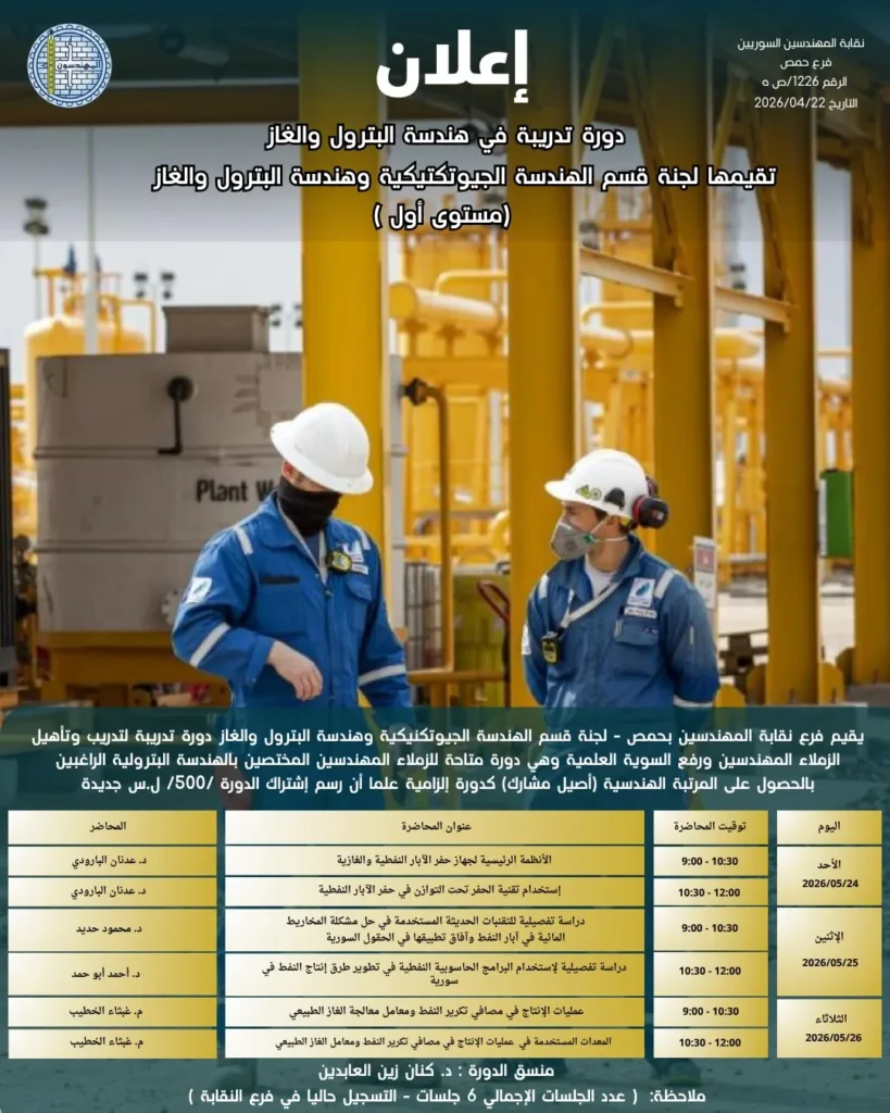 دورة تدريبية في هندسة البترول والغاز يقيم فرع نقابة المهندسين بحمص – لجنة قسم الهندسة الجيوتكنيكية وهندسة البترول والغاز دورة […]