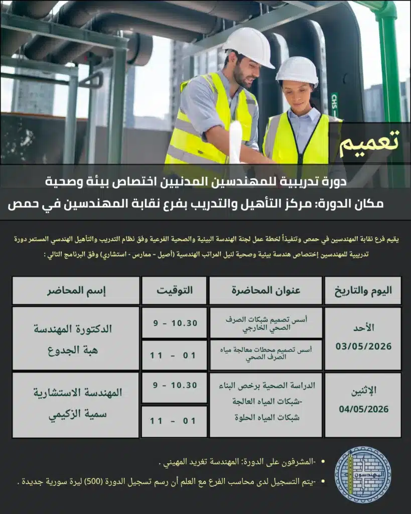 دورة تدريبية للمهندسين المدنيين اختصاص بيئية وصحية يقيم فرع نقابة المهندسين في حمص وتنفيذاً لخطة عمل لجنة الهندسة البيئية والصحية