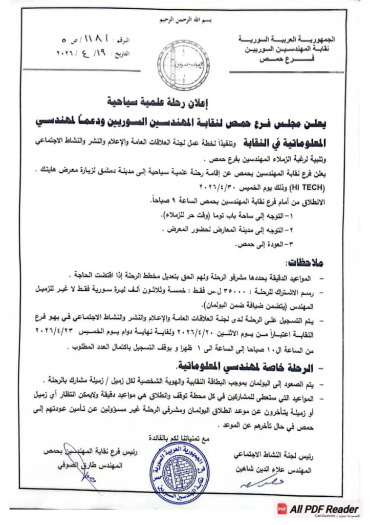 إعلان رحلة علمية سياحية إلى مدينة دمشق لزيارة معرض هايتك