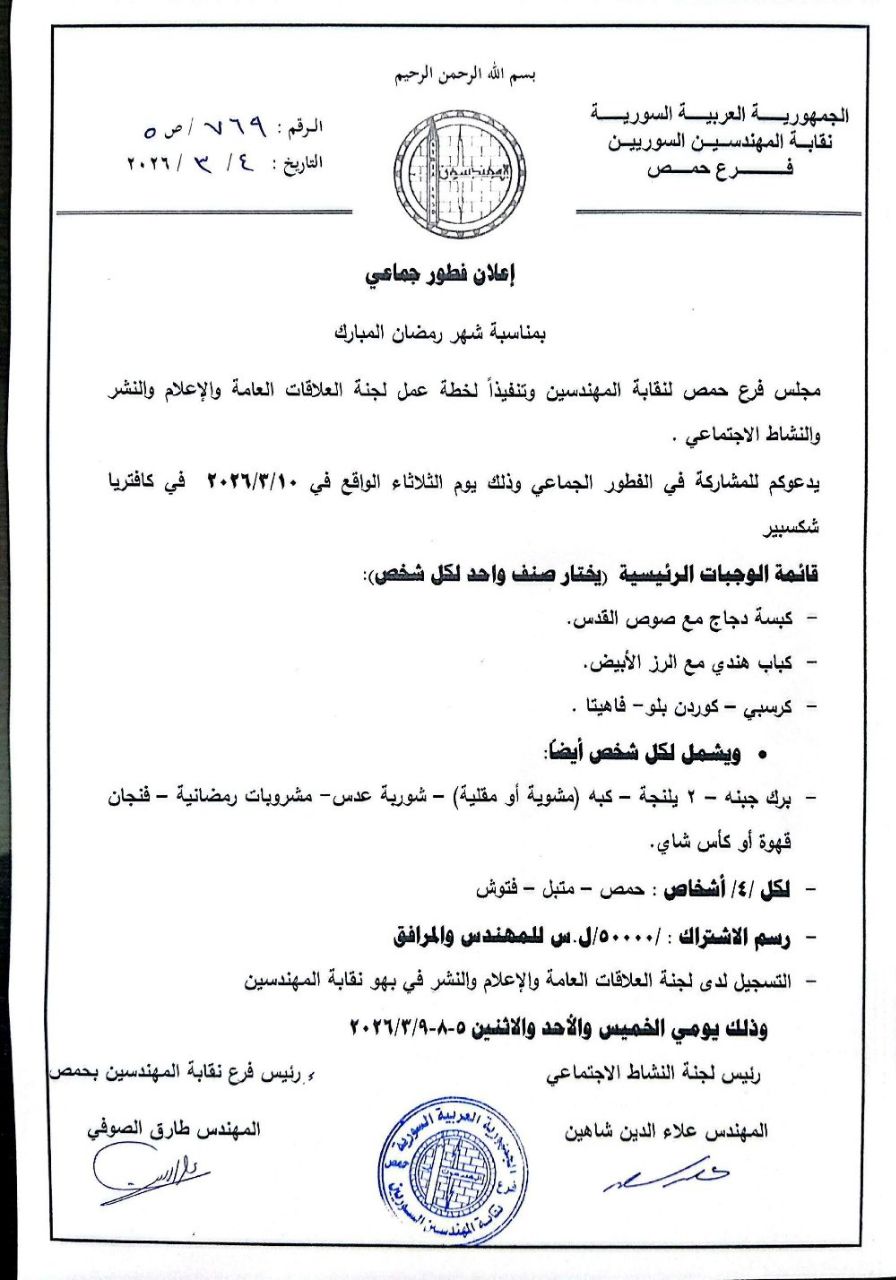 وفي هذا الإطار، تحرص نقابة المهندسين السوريين – فرع حمص على دعم هذه المبادرات الاجتماعية التي تجمع الزملاء المهندسين في أجواء رمضانية طيبة، بما يعزز روح التواصل والتعاون ويقوي الروابط المهنية والإنسانية بين أبناء النقابة.